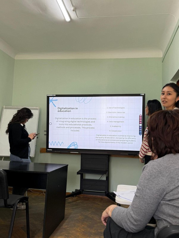 В рамках проекта GREENKG в Зеленом и Цифровом офисе Дипломатической академии МИД КР, проведена работа со студентами бакалавриата. Совместно со студентами были разработаны идеи зеленых и цифровых стартапов, направленных на внедрение устойчивых практик и инновационных решений как в университетах, так и в повседневной жизни.